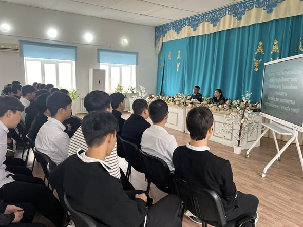 ПМК елді мекенінде орналасқан М.Әуезов атындағы жалпы орта мектебінде Құрманғазы ауданы Полиция бөлімі бастығының орынбасары полиция майоры Сарсембиев Дидар Сементаевич және кәмелетке толмаған істері жөніндегі учаскелік полиция инспекторы Ж.Түсіповамен бірлесе отырып, М.Әуезов атындағы жалпы орта мектебінде балалар қауіпсіздігі, зорлық-зомбылыққа жол бермеу, есірткі таратудың алдын-алу, жол қауіпсіздігі, бөтеннің мүлкіне қол сұқпау, буллинг және кибербуллинг мәселелері бойынша 10-11 сынып ұл балалар оқушыларымен құқықтық сауаттылықты арттыру мақсатында сөз сөйлеу ұйымдастырылды.