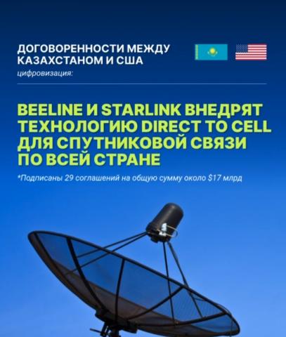 Қазақстан Республикасының Жасанды интеллект және цифрлық даму министрлігі, Beeline Қазақстан және Starlink компаниялары Direct to Cell технологиясын енгізу жөнінде өзара түсіністік туралы меморандумға қол қойды.