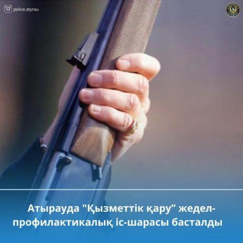 Атырау облысы аумағында 2 ақпан мен 20 наурыз аралығында республикалық «Қызметтік қару» жедел-профилактикалық іс-шарасы өткізіледі. Шараның негізгі мақсаты - қару айналымы саласындағы заңдылықты сақтау, құқық бұзушылықтардың алдын алу және қоғамдық қауіпсіздікті қамтамасыз ету.