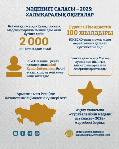 Биыл Ақтау қаласына Түркі әлемінің мәдени астанасы деген мәртебе берілді. Бұл мәртебені Халықаралық ТҮРКСОЙ ұйымы берді. Ақтау жиырмадан астам елдің мәдениет майталмандарын қабылдап, фестиваль, көрмелер, конференциялар мен шығармашылық жобалар ұйымдастырды. Сондай-ақ биыл Армения мен Ресейде Қазақстанның мәдени күндері өтті. Ал Қазақстанда Вьетнам халқының мәдени күндері ұйымдастырылды. Мұндай іс-шаралар халықаралық мәдени коммуникацияны нығайтып, елдің шығармашылық жобаларға деген қызығушылығын арттыруға ықпал етеді. 2025 жылы қазақстандық театрлар да айтарлықтай жетістіктерге жетті. «Астана Опера» театрының шетелдегі гастрольдері аншлагпен өтіп, театр әртістері әлемнің жетекші сахналарында жоғары бағаланды. Атап айтқанда, Нұрсұлтан Әнуарбек әлемдік операдағы ең беделді жобалардың бірі – Үлкен театрдың Жастар бағдарламасына конкурс арқылы қабылданды.