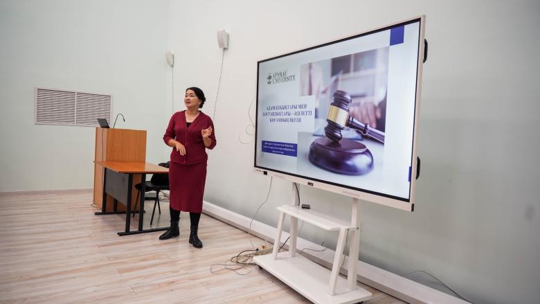 Дәріс барысында Адам құқықтары мен Заң тақырыбы төңірегінде “Әділетті қоғам дегеніміз не?”, “Адам құқықтарының маңызы қандай?” сынды сұрақтар талқыланып, студенттерге құқық пен заң тұрғысында құнды ақпараттар берілді.