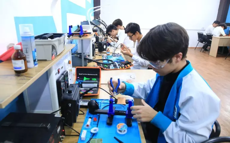 - Робототехника зертханасы – NAO гуманоид роботтары мен WorldSkills стандарттарына сай платформалар арқылы құрастыру және бағдарламалау дағдыларын дамытуға арналған.