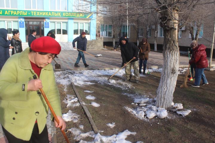 Аталған кәсіптік-техникалық білім ұясының директоры, партия мүшесі, аудандық мәслихаттың депутаты Болатбек Өтегенов: – Бүгін «Amanat» партиясының аудандық филиалымен бірге «Таза Қазақстан» акциясы аясында бейсенбілік сенбілік өткізгелі тұрмыз. Оған партияның аудандық филиалының өкілі Балағазы Иманғалиев қатысып отыр. Ауламызды, колледж айналасын тазарту жұмыстарын жасаймыз. Ауылымыздың тазалығы әрбір үйдің, көшенің, мекеменің тазалығынан басталады,– деп сәттілік тілеп, ортақ шаруаға өзі де атсалысты. Жастар, сабақ өткізуден бос ұстаздар, ұжым мүшелері акцияға ұйымшылдықпен қатысты.