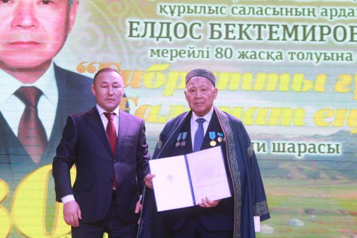 Атырау облысы әкімінің орынбасары Қайрат Нұртаев құттықтау сөз сөйлеп: – Елдос Бектемірұлы ағамыздың елге сіңірген еңбегін елеп, алыстан-жақыннан келіп жатқан ағайынға үлкен алғысымызды білдіреміз. Біздер бүгін Атырау облысының әкімі Серік Жамбылұлының тапсырмасымен сәлемін жеткізіп және өзіміздің де атымыздан құттықтайық деп осы шараға арнайы келіп отырмыз. Сізді сексеннің сеңгіріне аяқ басқан мерейлі қадамыңызбен шын жүректен құттықтаймыз. Ерен еңбегіңізбен, кәсіби шеберлігіңізбен Құрманғазы ауданының және облысымыздың экономикалық дамуына сүбелі үлес қосып, құрылыс саласының майталман маманы ретінде көпке мойындалдыңыз. Талай іргелі жобаның сәтті іске асырылуына тікелей жетекшілік етіп, ұйымдастырушылық қырыңызбен танылдыңыз. Сіз кешкен ғұмырдың ғибыраты мол. Ол өскелең ұрпаққа елжандылықты, еңбекқорлықты, туған жерге деген кіршіксіз қызмет пен табандылықты дәріптейді. Мерейтойыңызда сізге ізгі ілтипатымызды білдіріп, сарқылмас күш-қуат, зор денсаулық, отбасыңызға амандық тілейміз, – деп облыс әкімінің Құттықтау хатын табыс етіп, иығына шапан жапты.