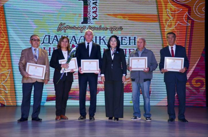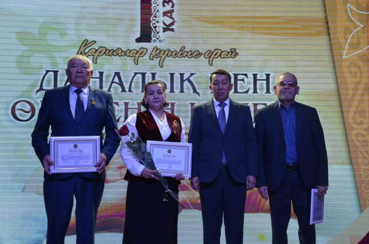 Аудандық ардагерлер кеңесінің төрағасы Ержан Ғайнетов ҚХА жанындағы республикалық аналар кеңесі төрағасының Алғыс хаты және салалық мәдениет, спорт, туризм және ақпарат қызметкерлері кәсіптік одағының «Еңбек даңқы» төсбелгісін Гаухария Төкестаеваға, қоғам қайраткері, ғалым жерлесіміз «Саттар Имашевтің туғанына 100 жыл» төсбелгісін еңбек ардагерлері Уахит Масалов, Қатира Бекешева, Балғаным Хасеноваға табыстады.