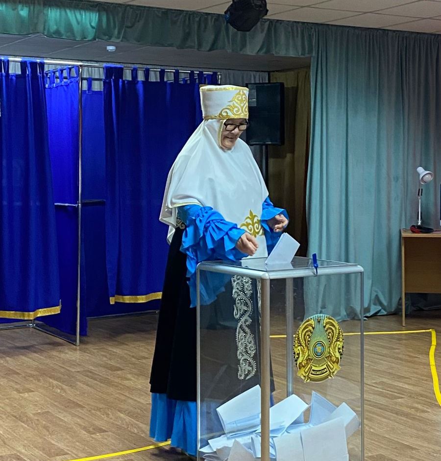 58 жастағы Гүлмира Дюсеғалиева, Қиғаш ауылының тұрғыны, №183 референдум учаскесіне ұлттық киіммен келді.