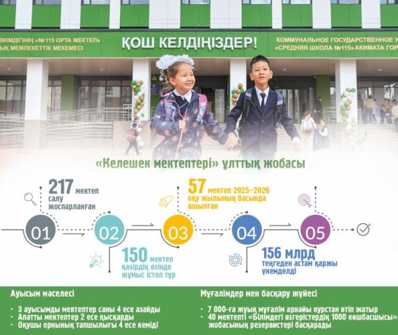Еске сала кетейік, 2025–2026 оқу жылының басында 83 оқу ошағы жаңадан ашылды, оның 57-сі – «Келешек мектептері» ұлттық жобасы аясында салынған мектептер. Оқу-ағарту министрлігінің мәліметінше, үш ауысымды мектептер саны 4 есе, апатты жағдайдағы мектептер 2 есе, оқушы орнының тапшылығы 4 есе қысқарған. Мәселен, биыл Шымкент қаласында, Ақмола және Қызылорда облыстарында үш ауысымды мектептер мәселесі жойылған. Қазір елімізде шамамен 3 мың мектеп бір ауысымда, 5 мың мектеп екі ауысымда жұмыс істейді.