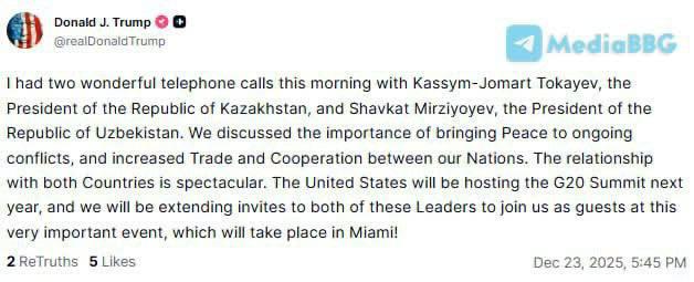 АҚШ келесі жылы G20 саммитін қабылдайды және біз көшбасшыны Майамиде өтетін осы өте маңызды іс-шараға қонақ ретінде қатысуға шақырамыз», — деп жазды АҚШ президенті.
