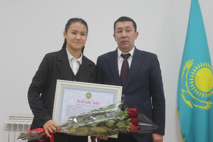 Аудандық білім бөлімінің басшысы Еділ Баяров: – Соңғы жылдары оқушыларымыз спорттың әр түрінен жүлде алып, ауданымыздың мерейін көтеріп жүр. Солардың бірі және бірегейі ортамызда отырған Ботагөз қызымыз спорттың жалпы облыс, республика бойынша кенже дамыған түрлеріне жататын футболды дамытуға бесінші сыныптан бастап үлкен үлес қосып келеді. Спортта ұстаздарынан алған тәрбиесі мен білімін жетілдіріп республика бойынша ең үздік жас спортшы деген атаққа қол жеткізді. Бұл өте жоғары көрсеткіш. Алға қарай елімізде, халықаралық жарыстарда, олимпиадада жеңімпаз атанып, ауданымыздың, облысымыздың мерейін үстем қылып, мемлекетіміздің көк туын желбіретеді деген сенім білдіреміз. Болашағыңыздың жарқын болуына тілектеспіз,– деп Құттықтау хатын, естелік сыйлығын, 100 мың теңгенің сертификатын, ата-анасына Алғыс хатын табыс етті.