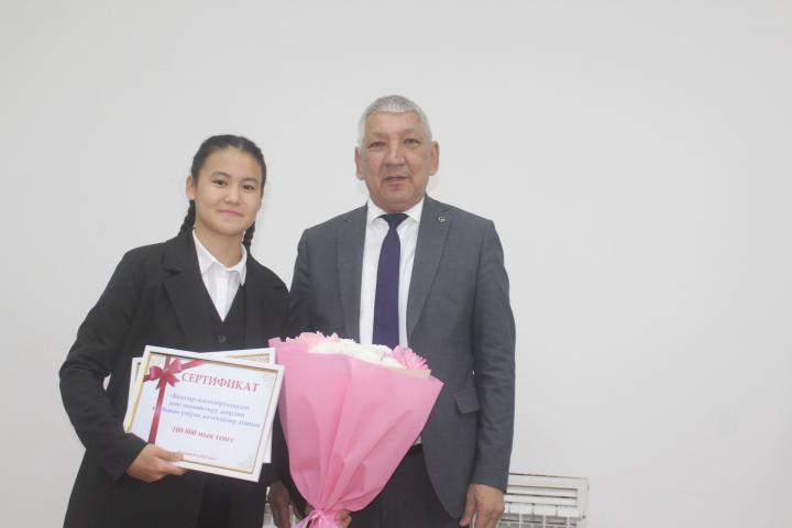 Соңында М.Әуезов орта мектебінің директоры Гауһар Құбашева сөйлеп, жас спортшыға сәттіліктер тілеп, Құттықтау хат және 50 мың теңгенің сертификатымен ұлықтады.